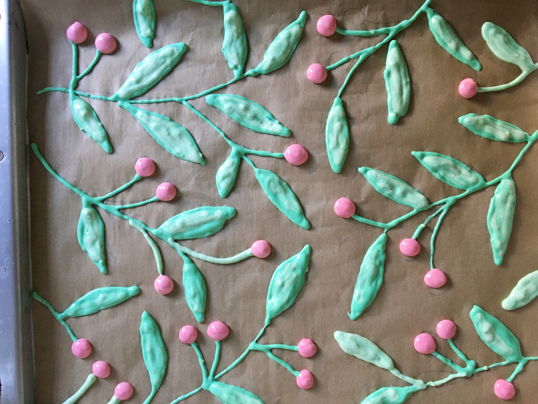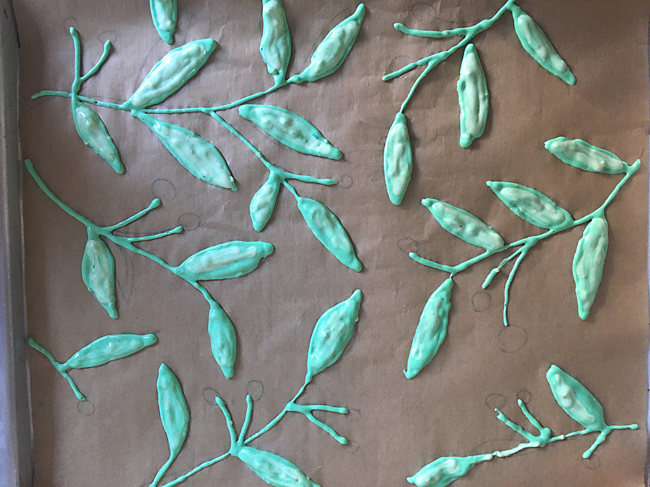 - mit einem Spritzbeutel die Ranken und Früchte auf das Backpapier spritzen
