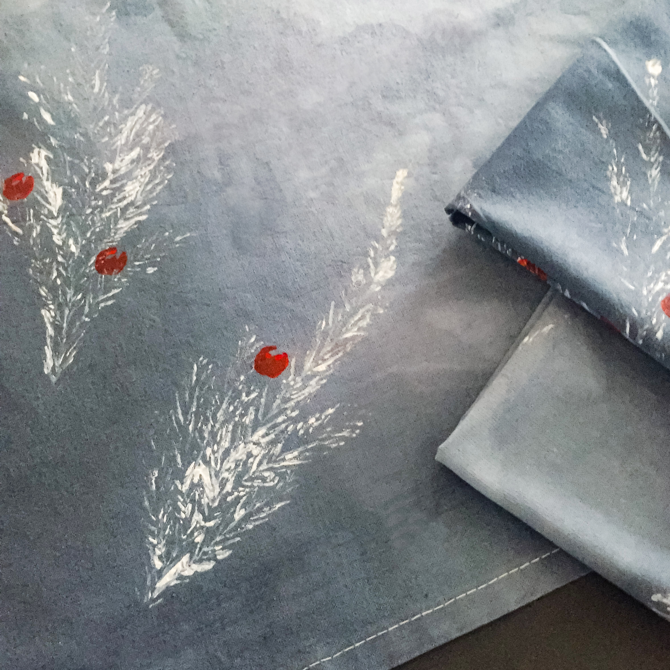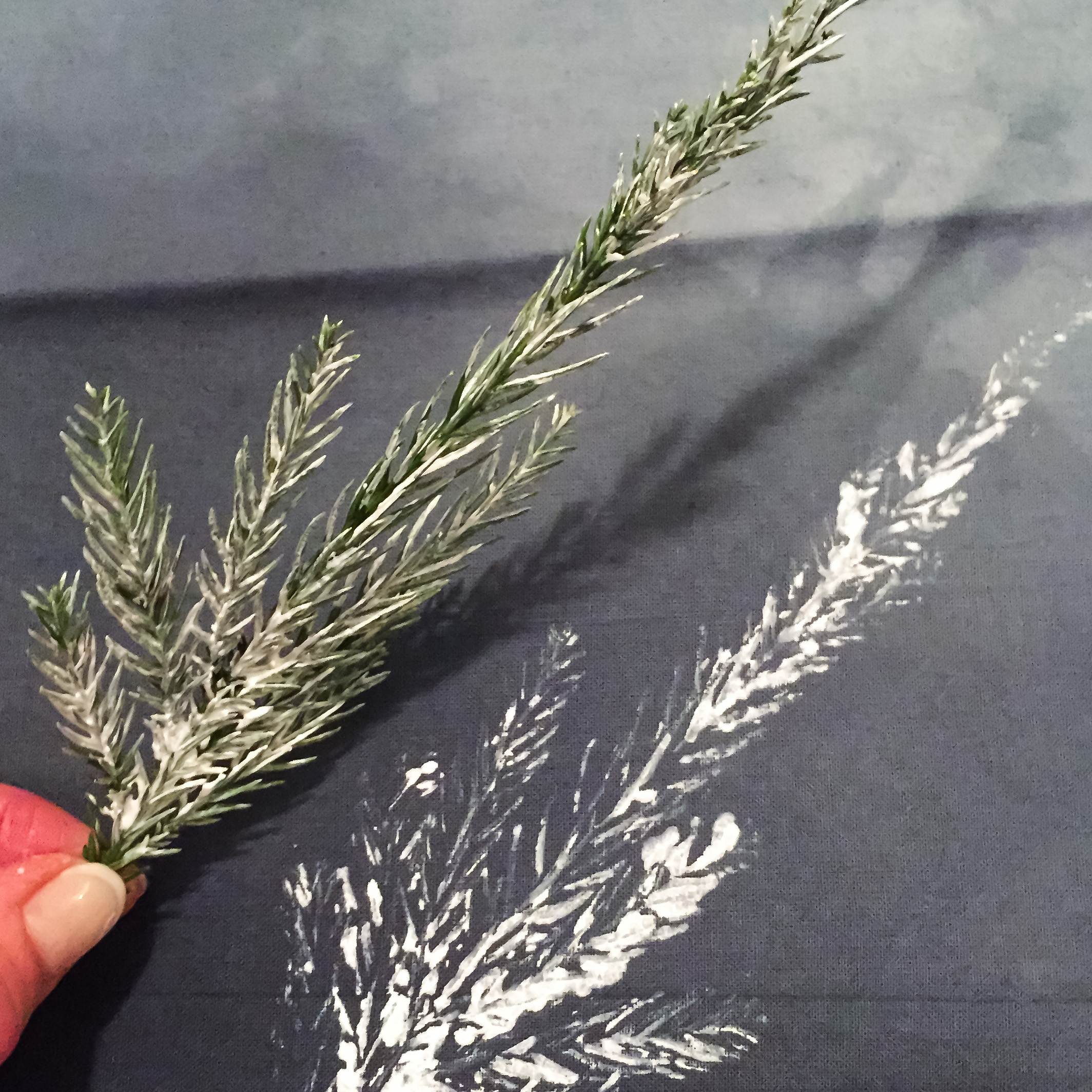 Die Serviette vorher bügeln, dass die Stempelfläche keine unschönen Trocknungsfalten hat. Tannenzweig mit Textilfarbe anpinseln und feste auf die Serviette drücken, hierbei ein Stück Küchenrolle darüber legen. Bei jedem Stempelvorgang ein neues Stück Küchenrolle nehme, damit sich nichts von den vorherigen Farbresten auf die Serviette drückt.