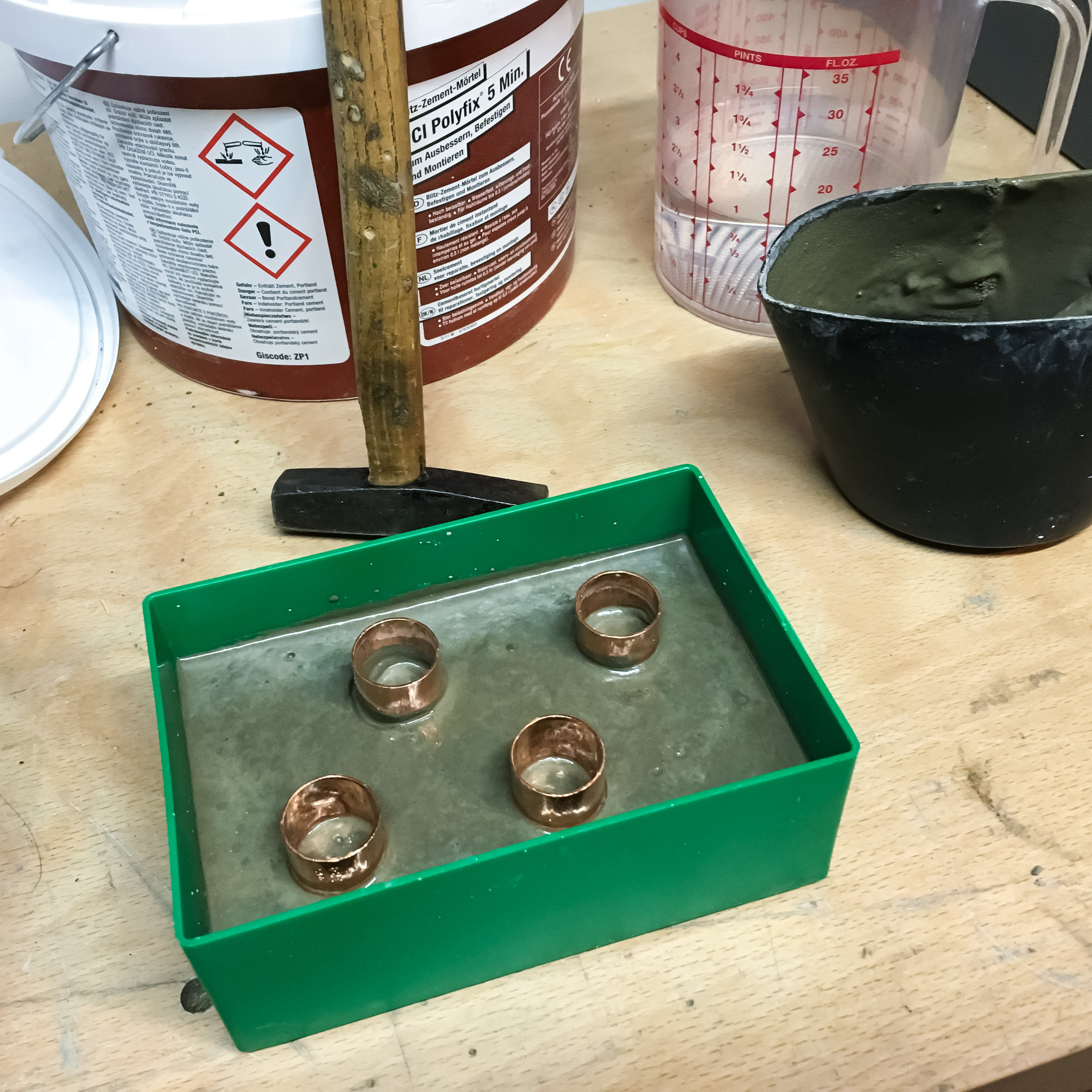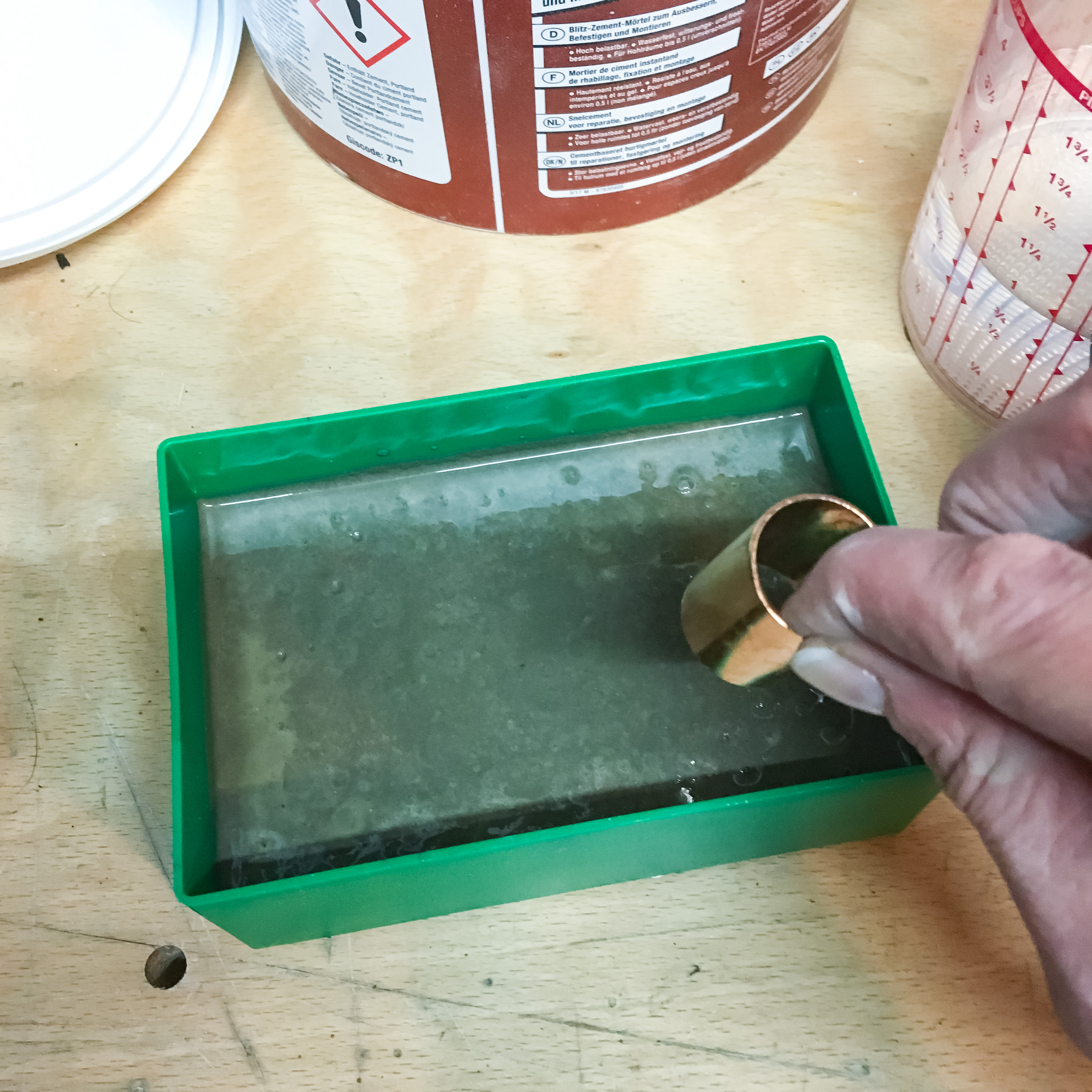 - in die Schale gießen und mit einem Hammer leicht dagegen stoßen um die Luftbläschen aus dem Beton zu holen.