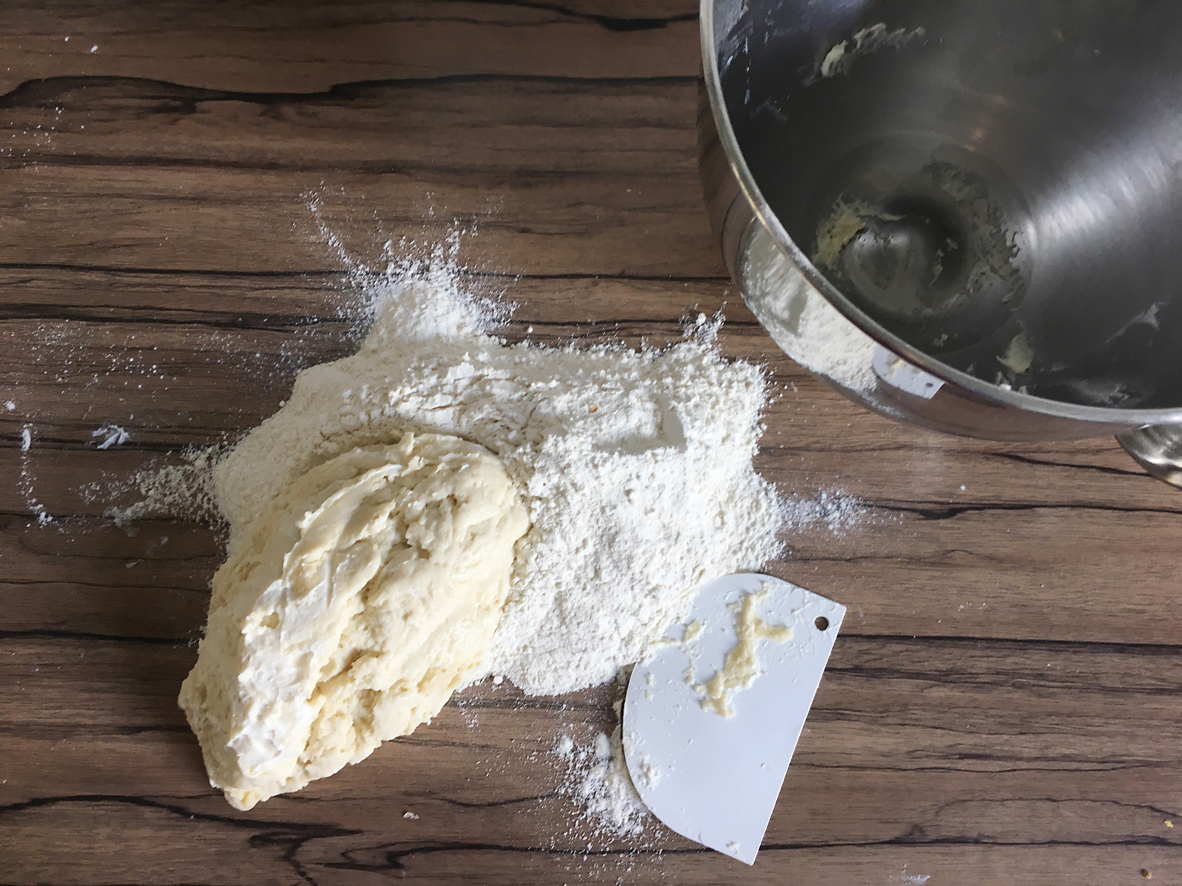 - alle Zutaten auf Küchenarbeitsplatte von Hand oder mit Hilfe einer Küchenmaschine verkneten