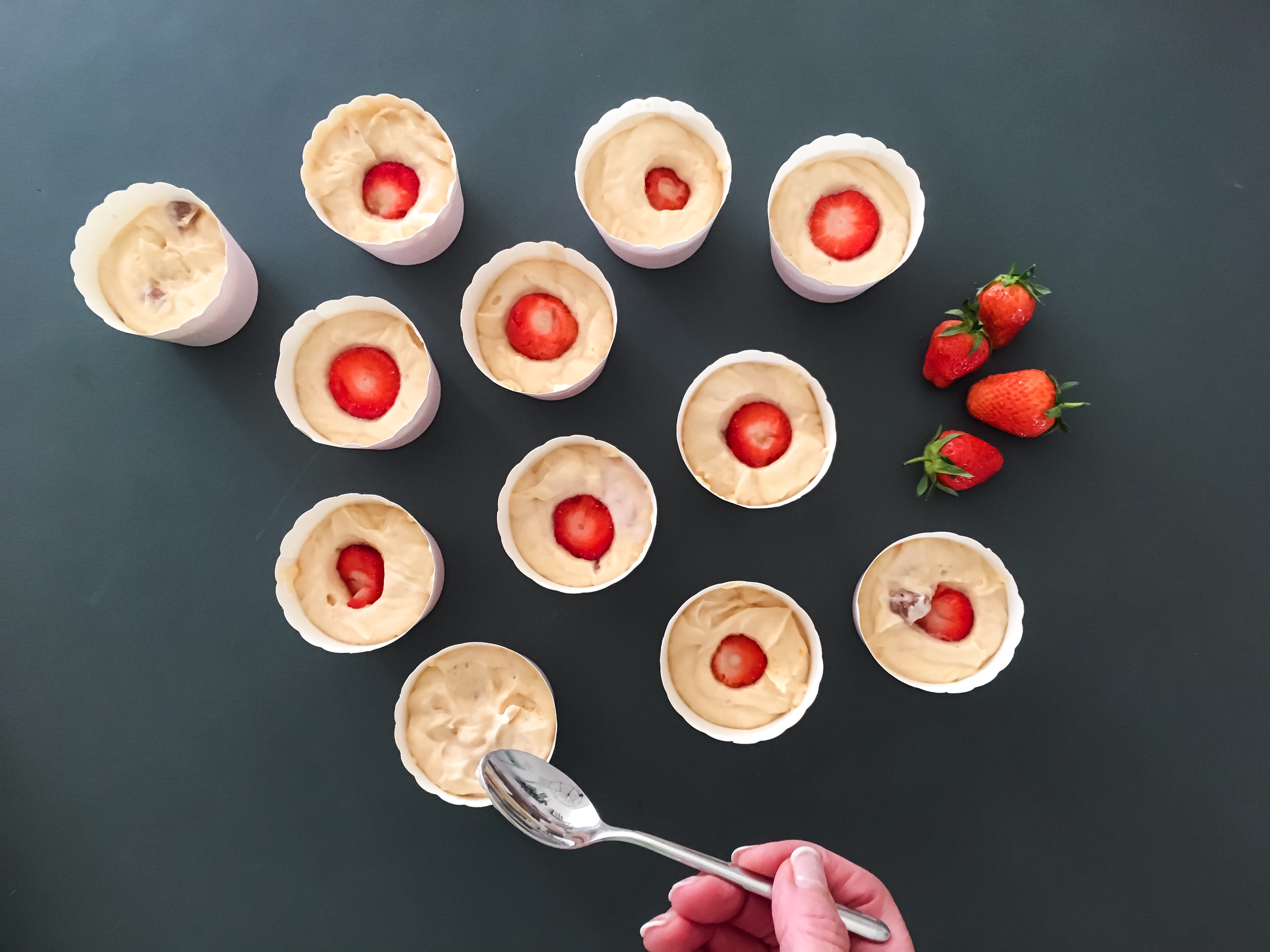 - je eine Erdbeere in das Förmchen drücken