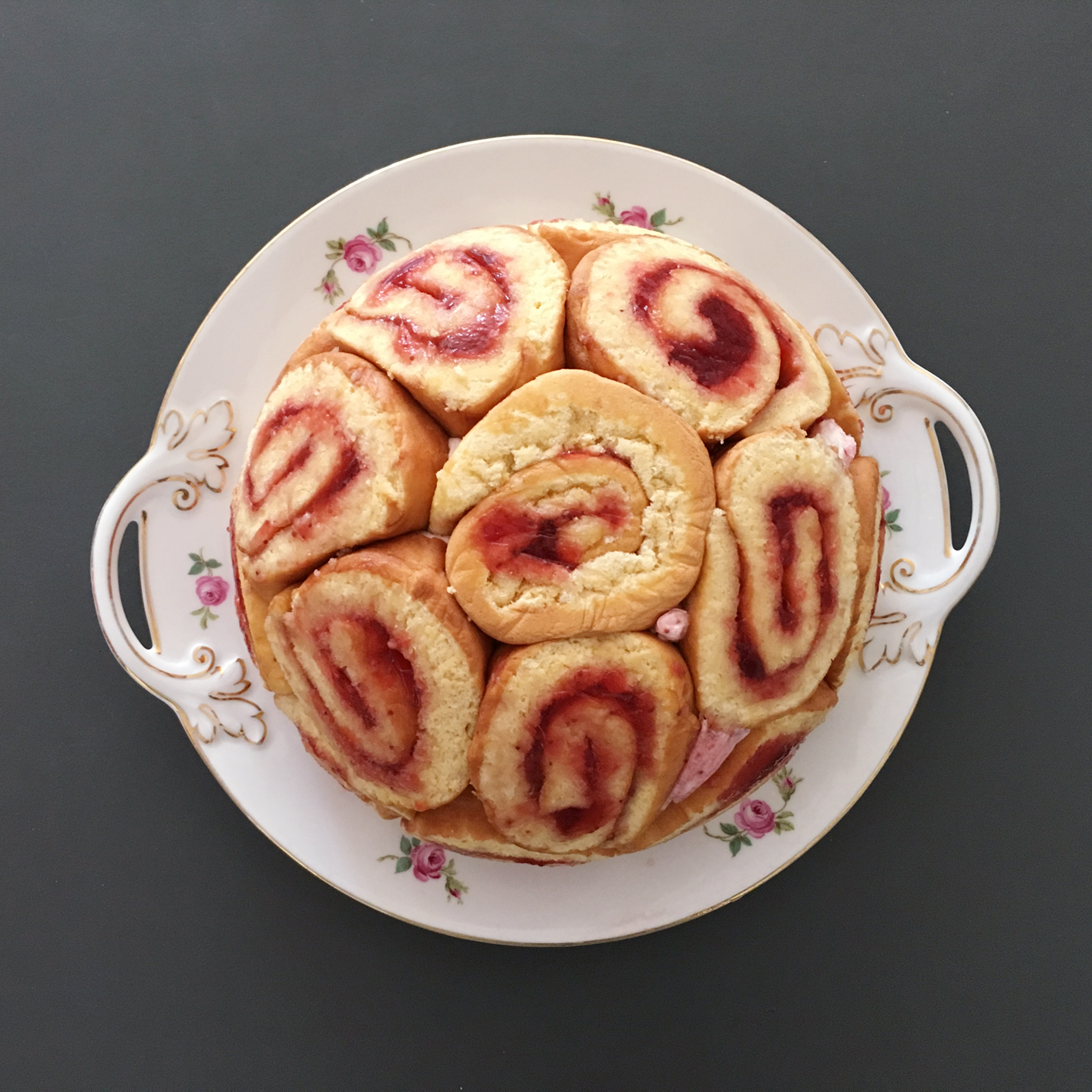 - Konfitüre auf Biskuitboden streichen und wieder aufrollen
