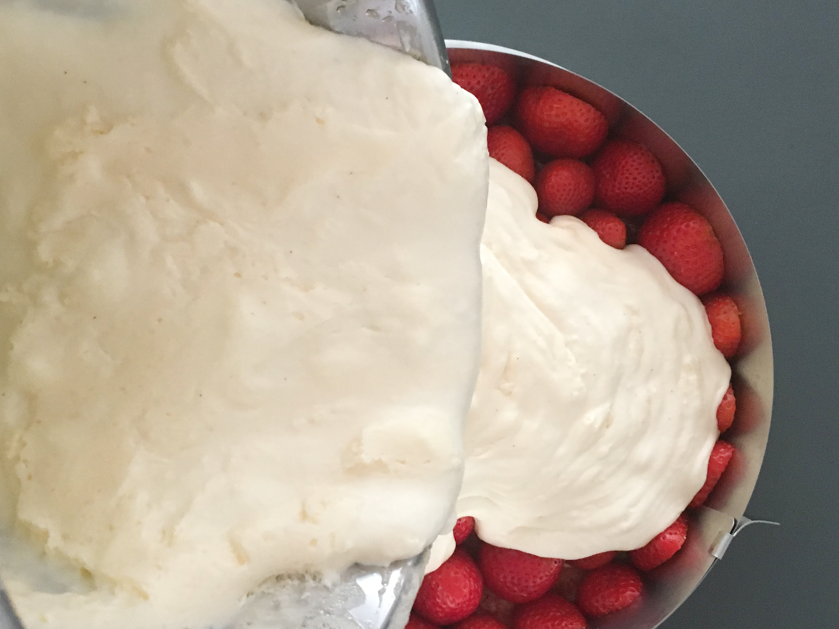 - Füllung vorsichtig auf die Erdbeeren verteilen