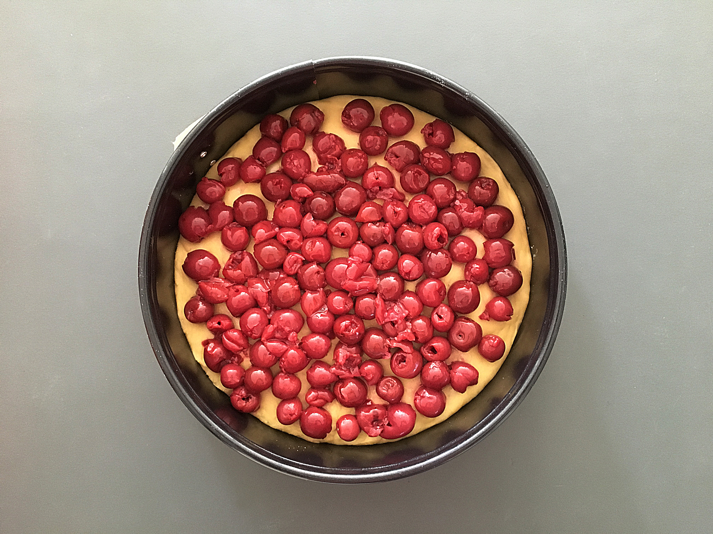 - Kirschen abtropfen lassen und auf Boden verteilen