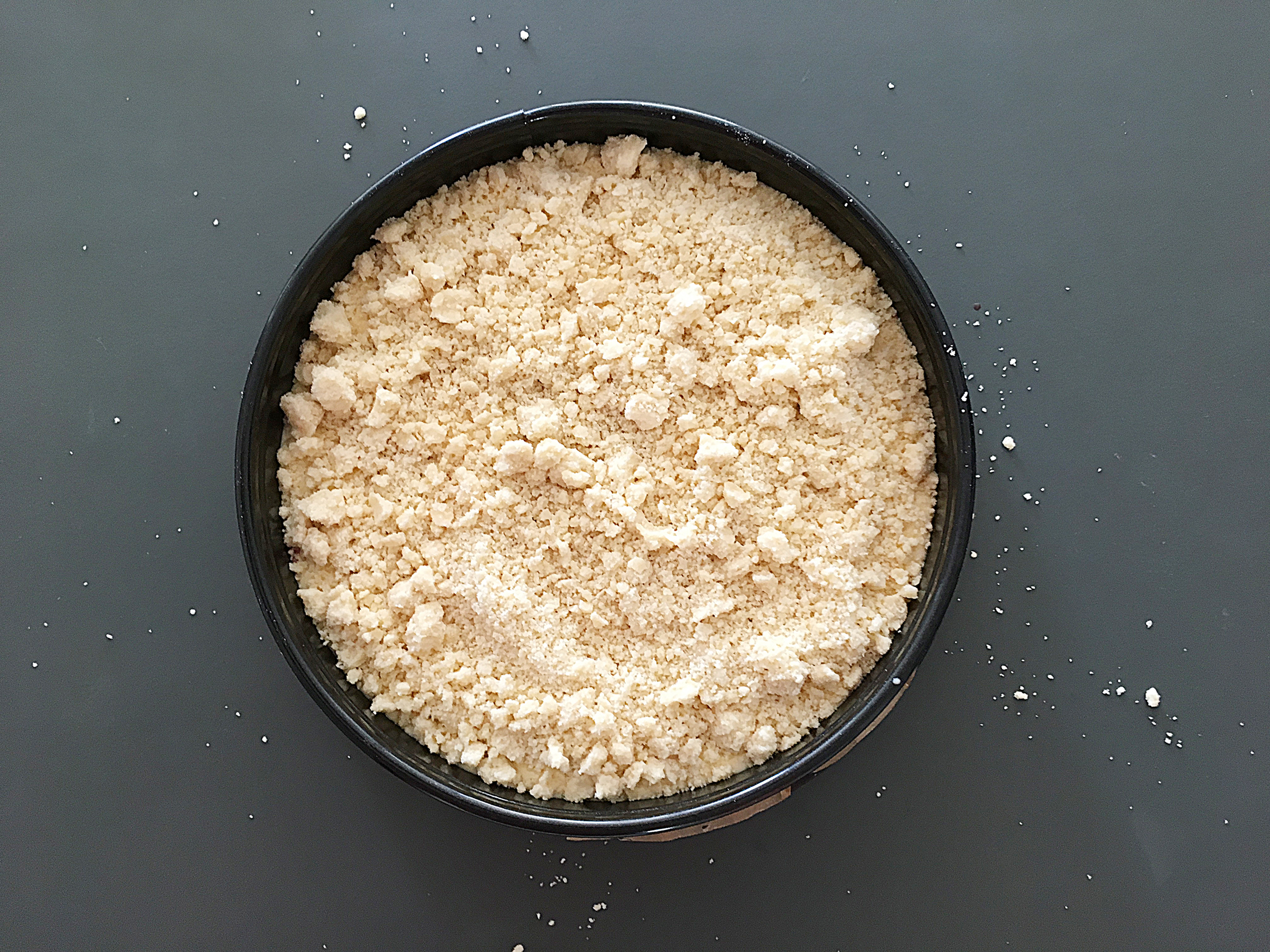 - Butter, Zucker und Mehl zu Streuseln kneten und auf dem Kuchen verteilen