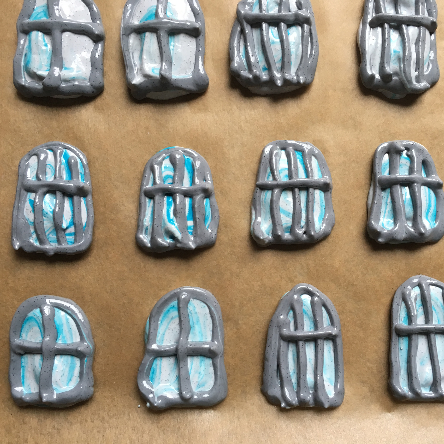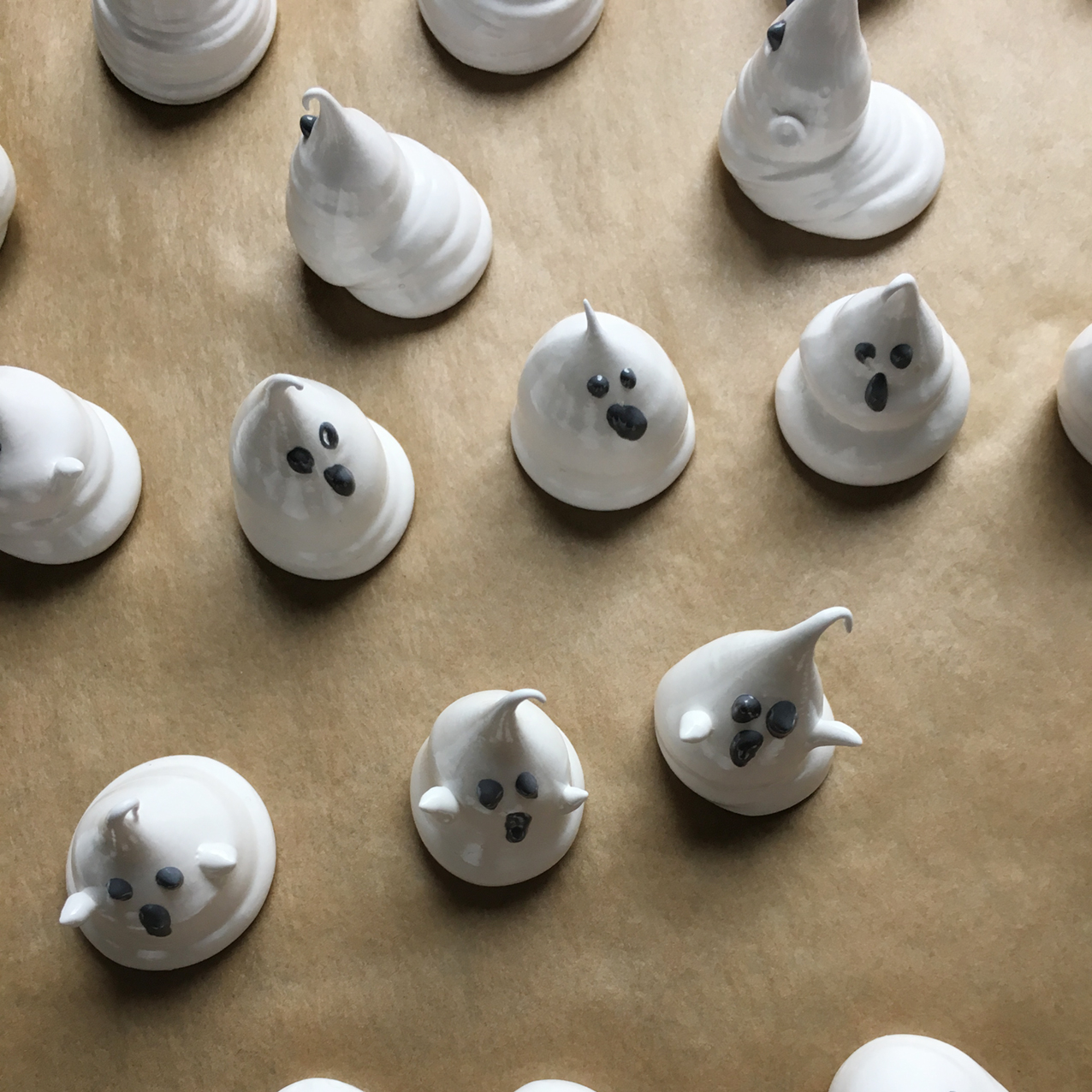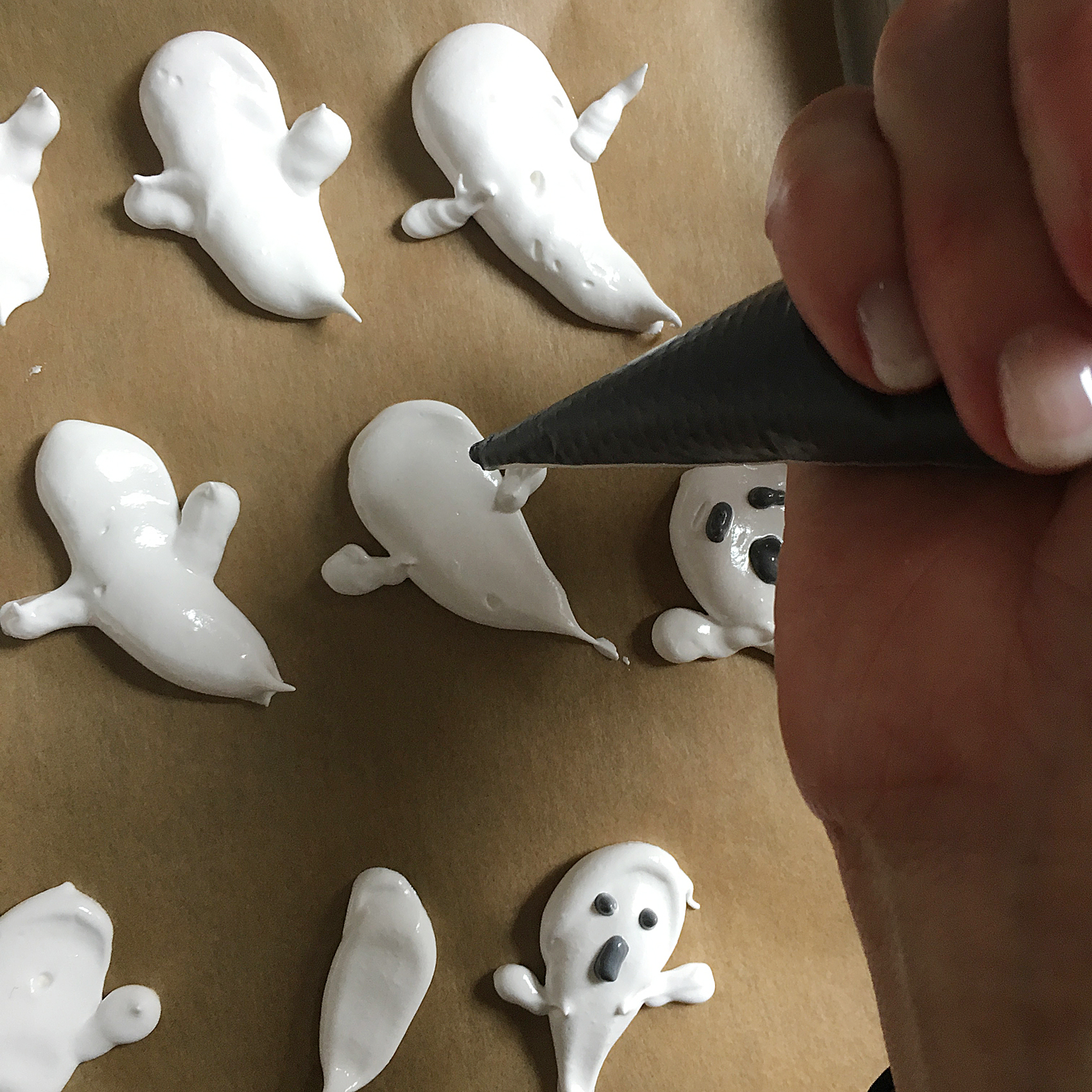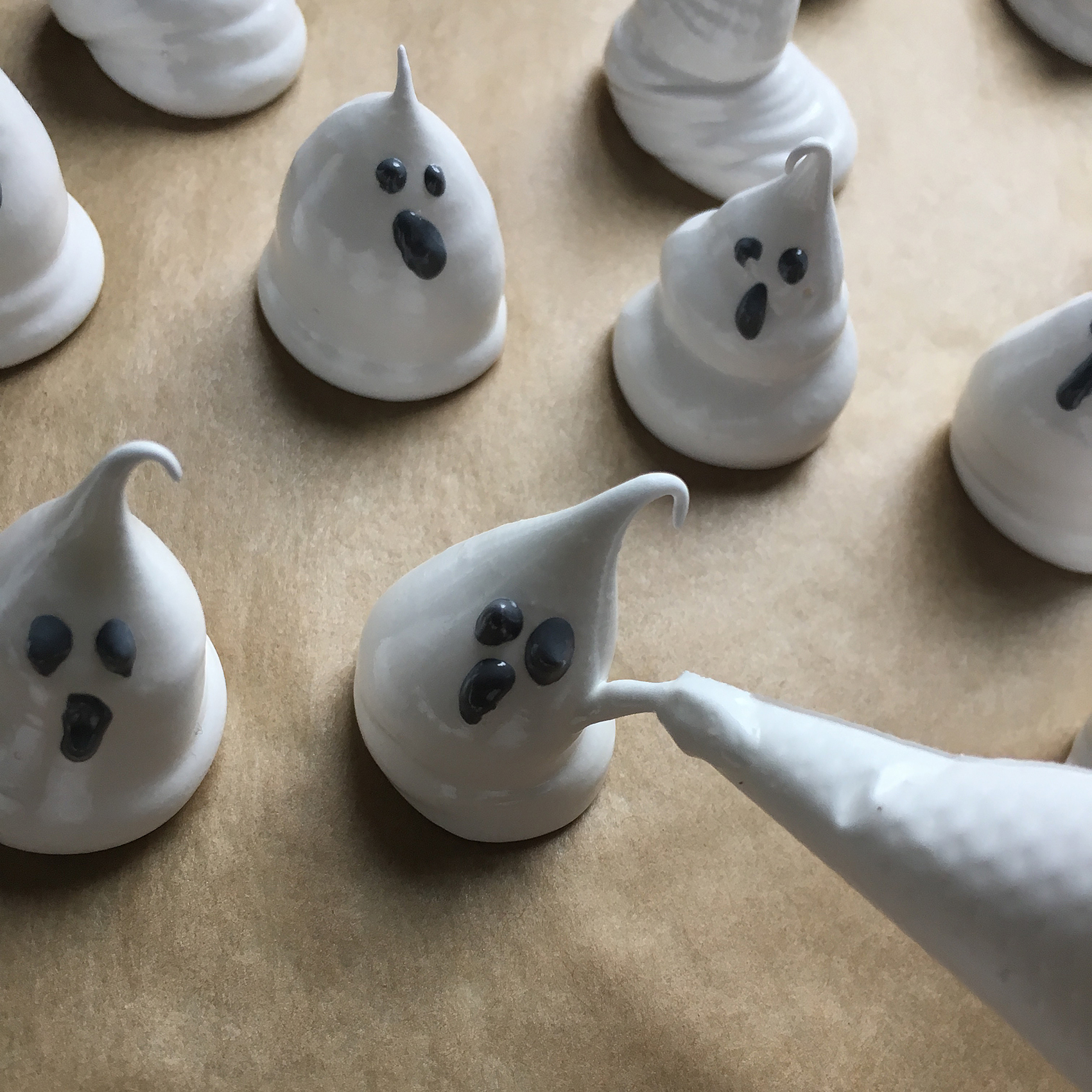 - mit Spritzbeutel Gespenster, Fenster und Dächer auf Backblech spritzen