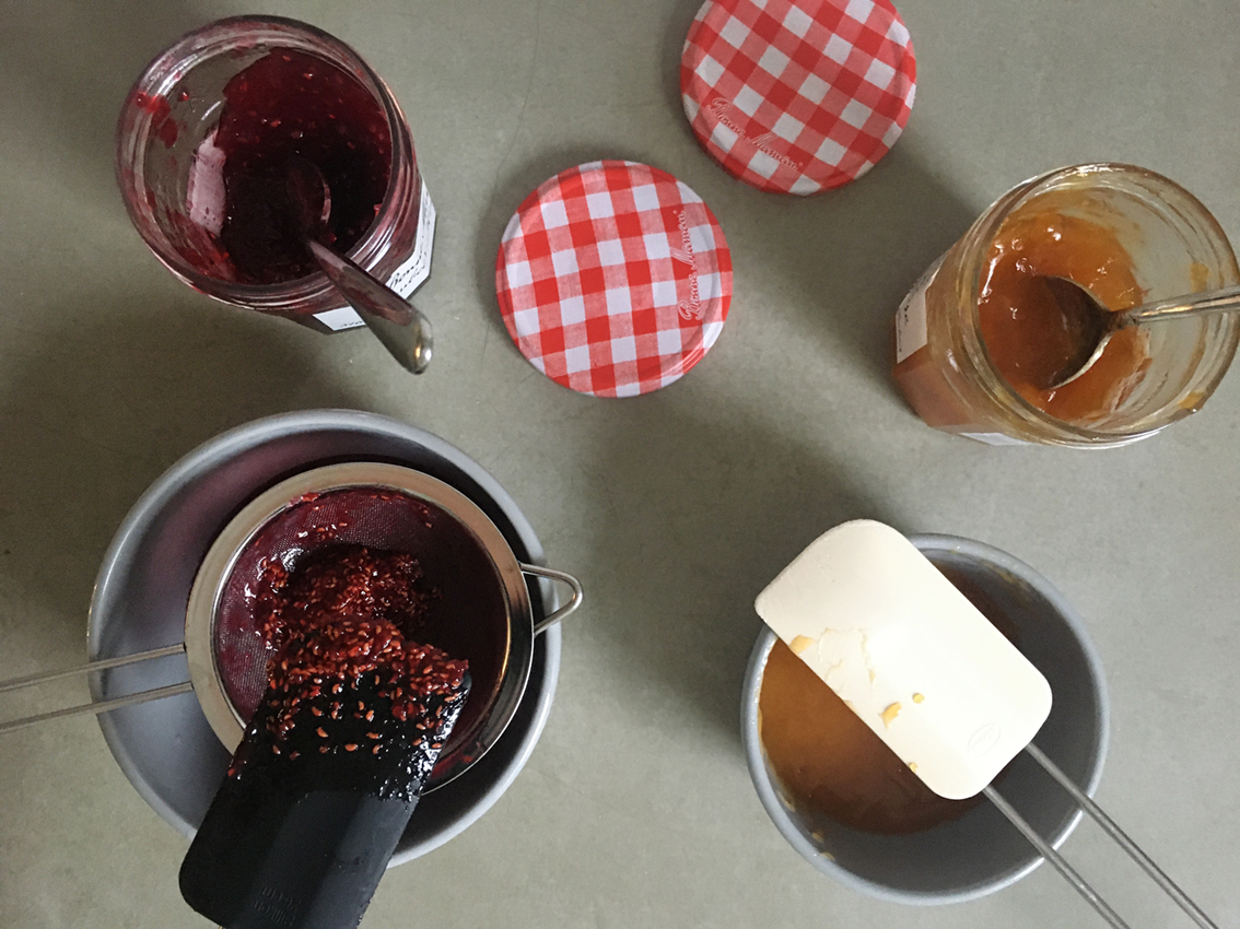 • Marmelade mit Spritzbeutel auf die unteren Plätzchen spritzen