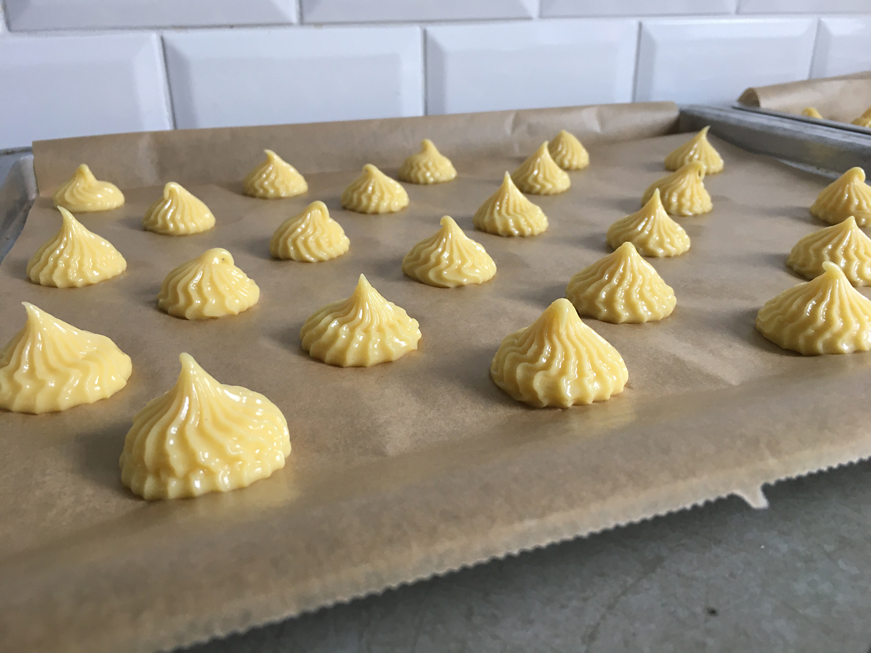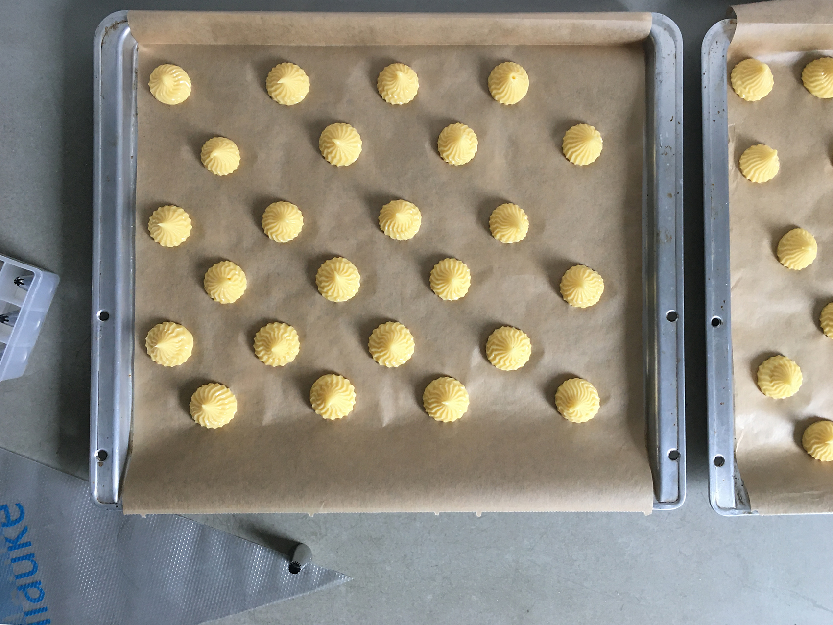 - Teig mit Spritzbeutel auf das Backblech spritzen