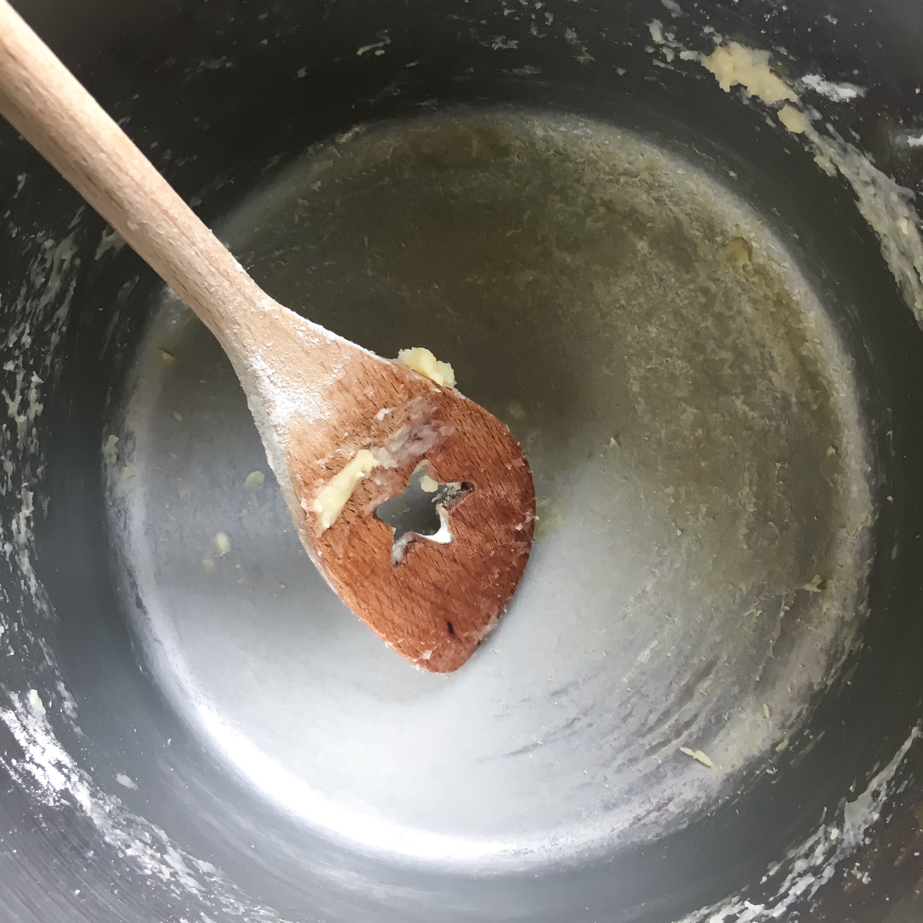 - Herdplatte auf niedrig stellen und Mehl dazugeben