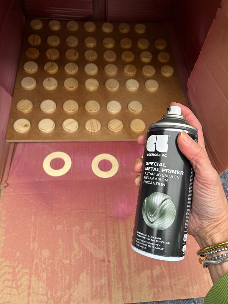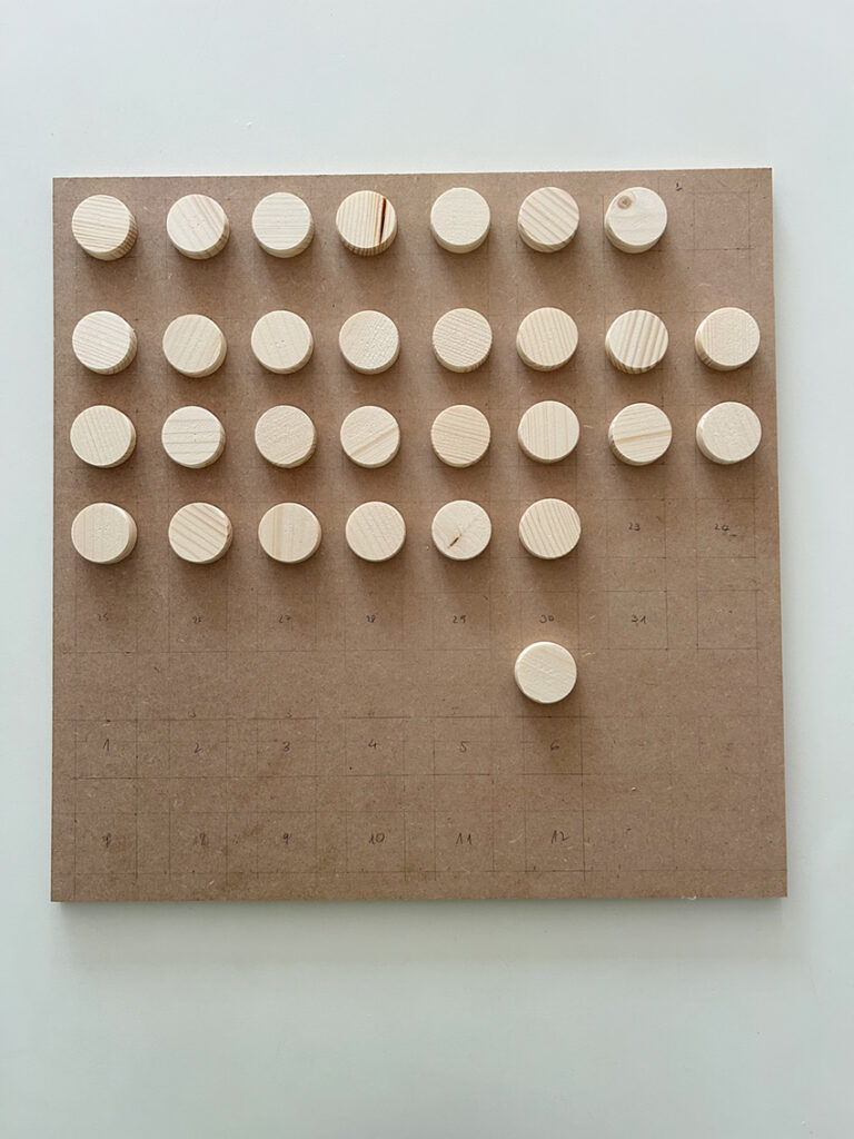 MDF-Platte (440 x 465 mm) // MDF-Platte für drei Kreise 220 x 80 mm // 50 Holzplättchen (z.B. hier) // Holzkleber // Schleifpapier // Grundierung (z.B. hier)* // Sprühfarbe, (z.B. hier)* // Kreisbohrer 64 mm und 38 mm // Vorlage für Zahlen und Schrift plotten oder plotten lassen // Aufhängung